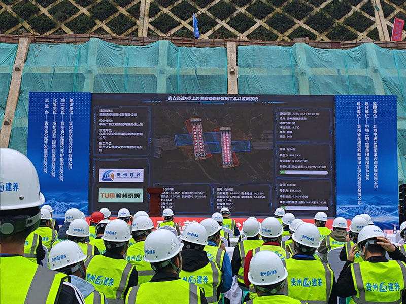 面对大角度双幅转体所带来的多重技术挑战与安全风险,贵州省公路建设养护集团及柳州泰姆公司等多家参建单位,积极开展科技攻关与工艺创新,成功应用了三项关键施工技术体系。首先,采用高精度转体球铰装置,该装置作为转体结构的“核心关节”,有效保障了桥体在转动过程中的平稳性与结构可靠性。其次,施工中运用了智能转体牵引系统,该系统能够对左右两幅桥体进行实时协同调控,确保双幅在转动过程中始终保持高度同步,实现了毫米级的精准控制。此外,还运用北斗监测系统相结合,构建起一套完整的桥梁姿态实时监测预警体系。在转体施工现场,这三项技术相互配合、协同发力,历时约两小时,双幅转体桥精准到达设计位置。