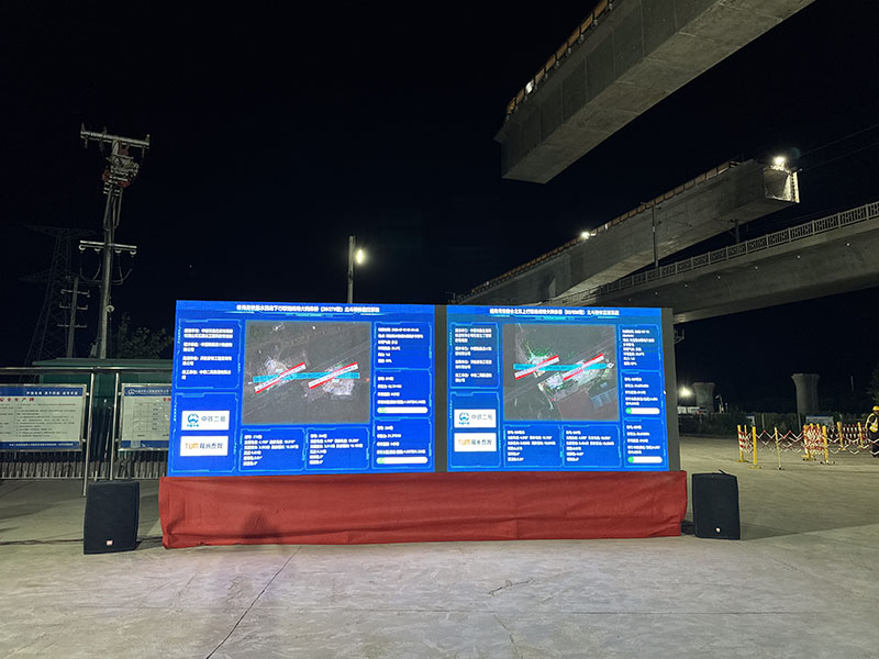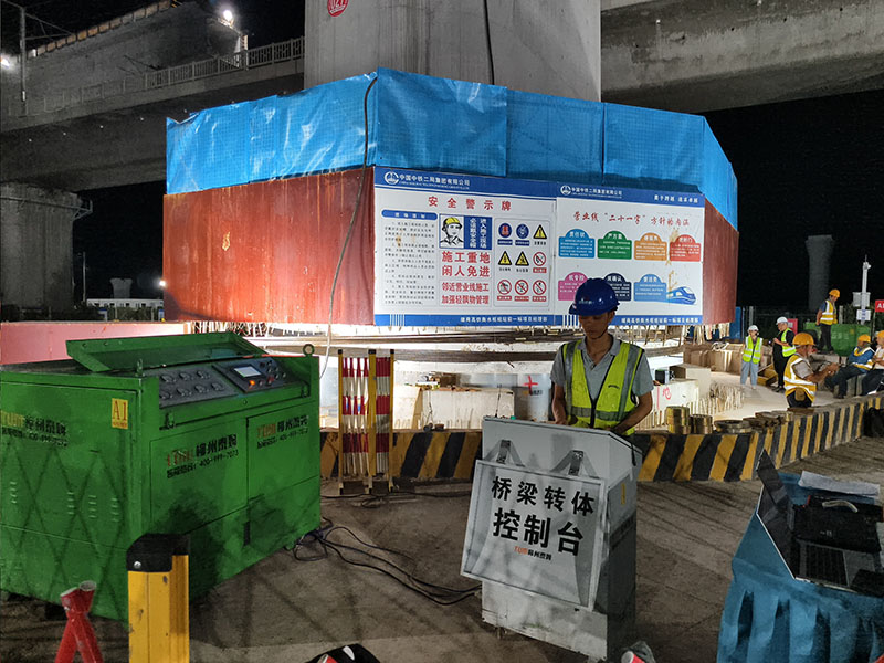 为了攻坚克难,中铁二局与柳州泰姆公司组建联合技术攻关团队,在转体前进行了多次模拟演练,不断优化应急预案和技术参数。7月15日凌晨,随着现场总指挥一声令下,两座大桥在千斤顶牵引下以桥墩为轴缓缓转动。施工转体团队运用北斗高精度监控系统实时跟踪转体过程,动态调整转体速度、角度、扭力等参数,确保转体平稳可控。在全体建设者的精心操作下,两座大桥如同被赋予生命一般,在夜空中沉稳“华丽转身”。最终,在有限的铁路运行"天窗期"内顺利实现转体对接分秒无误。