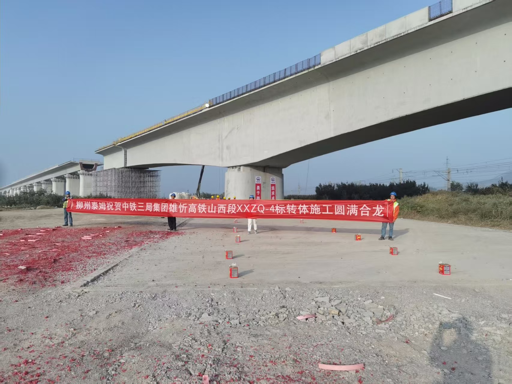 9月30日7时30分,总重约2.3万吨的两组T构梁在逆时针同步旋转33°后平稳就位,标志着雄忻高铁同河特大桥跨朔黄铁路转体梁顺利完成转体。该转体梁由中铁三局承建、柳州泰姆公司承接球铰系统制造与转体牵引施工,是全线跨度最大、重量最大的控制性工程,此次成功转体突破了关键施工瓶颈,为后续工程推进创造了有利条件。