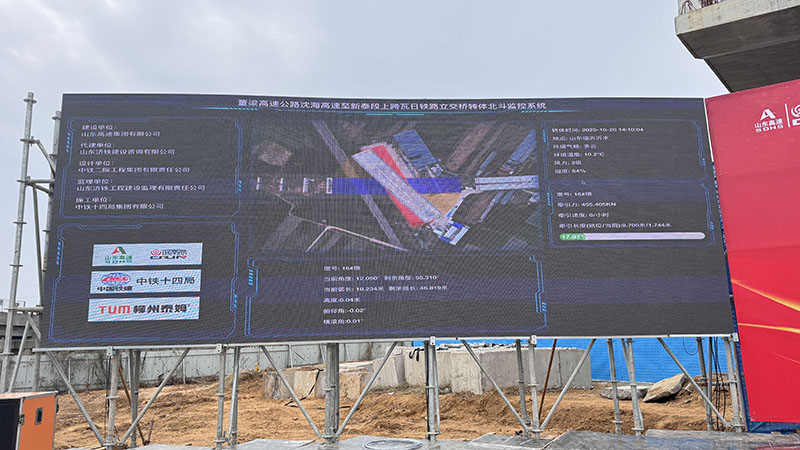 为确保顺利精准完成转体工作,中铁十四局与柳州泰姆公司等参建单位协同作业,预先进行了12°的试转体,系统采集并验证了运行速度、惯性等关键参数,全面检验转体、牵引与平衡等各系统运行的协调性与可靠性。正式转体过程中,项目转体团队依托智能牵引系统实时监测转体速度与空间姿态,并融合智能北斗监控系统,实现对梁体转体全过程的高精度动态控制。最终,在铁路运行“天窗期”内,桥梁平稳跨越瓦日铁路,实现毫米级精准就位。