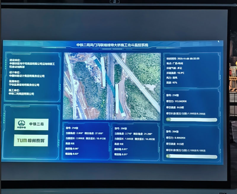 为保障转体施工安全高效推进,中铁二局协同柳州泰姆等专业单位,在充分论证基础上不断优化实施方案,并组织全流程模拟推演。在正式转体前组织试转操作,通过智能牵引系统全面检验关键设备运行参数与结构响应数据。转体期间,严格执行柳州泰姆专项工艺标准,并借助北斗监控系统,实时跟踪梁体空间姿态、转动速度及关键部位应力变化,结合高精度测量数据进行动态调控与纠偏。通过一系列精密控制措施,最终圆满实现转体梁的毫米级精准就位。